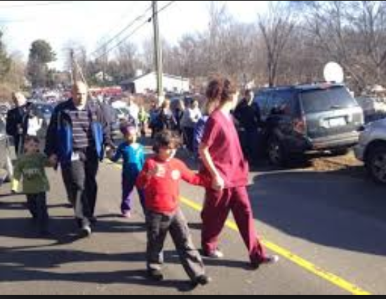 Anyway, take another look at the more infamous of the two Shannon Hicks photos, which is the one with the crying girl in the blue shirt. There’s an uncropped, high (enough) quality version of it here. Each of the thirteen visible children in this photo are wearing long-sleeved shirts and two of them are wearing scarves. Do you really think kids from the Northeast are wearing scarves in October? Especially since the average temperature for October of that year was 62 (although, funny enough, there were eight days that month where the average temperature was between 40-50F). There are fewer children visible in the other Shannon Hicks photo, but as far as I can see, all of them are wearing long-sleeved shirts. Again, none of them are wearing jackets for the same reason none of them have their backpacks; because their belongings were left behind as the fled a gunman. As for anyone that may have been wearing a short-sleeved shirt, I looked through every last photo I have that was taken that day and I only saw one, and that’s Robbie Parker (who, if I’m not mistaken, rushed over from work because there was a shooting at his child’s school, so it’s entirely plausible that he not only did not expect to be outside for an extended period of time, but did not have the time to prepare himself. Or maybe he just doesn’t mind wearing shirt-sleeve shirts in 45 degree weather). His wife on the other hand is wearing what looks like a medium weight jacket and a scarf:
